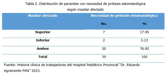 En un estudio realizado en el municipio de Majibacoa, Suarez González et al.,4 plantea que existe un mayor índice de necesidad de prótesis estomatológica en ambos maxilares con un 44.9 % seguido del maxilar superior con un 38.4 %. La presente investigación coincide en cuanto a la prevalencia de pacientes según maxilar afectado, no así en cuanto al porcentaje.