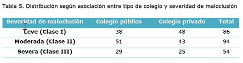 Al agrupar los tipos de maloclusión en función de su severidad, se evidenció que los escolares del colegio público presentaron un mayor porcentaje de maloclusiones moderadas a severas (Clase II y III), mientras que, en el colegio privado, las maloclusiones leves (Clase I) fueron las más prevalentes. Esta diferencia sugiere una posible relación entre el tipo de institución educativa y el acceso a tratamiento preventivo (Tabla 5).